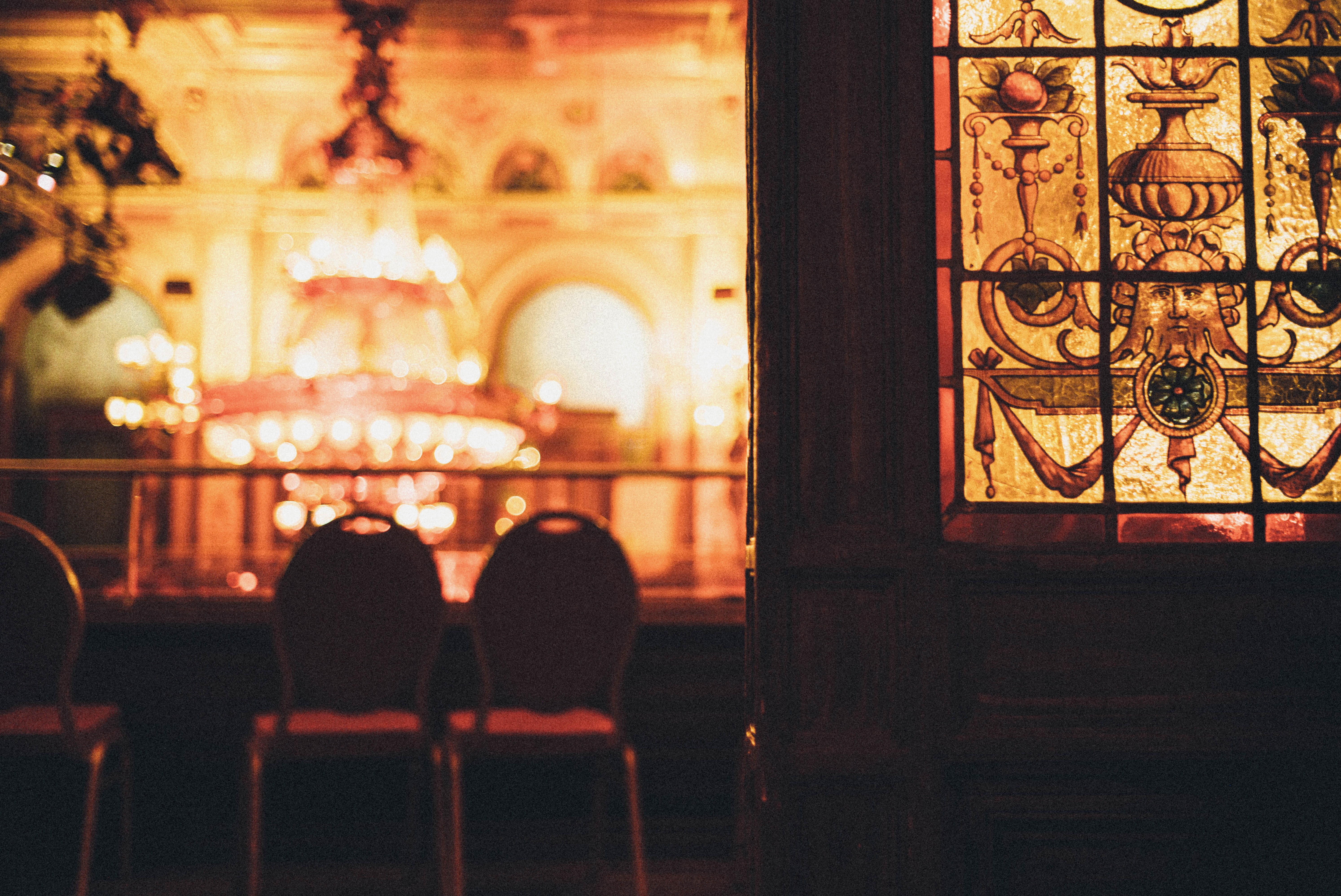 This photograph captures an opulent interior, framed by the ornate stained glass, which bathes the scene in warm, golden hues. A grand chandelier glows in the background, lending an air of nostalgia and luxury, while the empty chairs invite contemplation. The soft focus and rich colors evoke a sense of intimacy and grandeur, embodying a timeless elegance.
