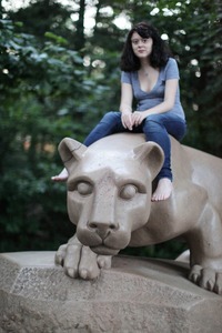 A young woman sits atop a large stone sculpture of a panther, her bare feet resting on its back. The soft, diffused light filtering through the surrounding foliage casts an intimate atmosphere, enhancing the calm yet adventurous mood of the composition. The juxtaposition of the living subject with the still sculpture creates a dynamic sense of interaction between nature and art.
