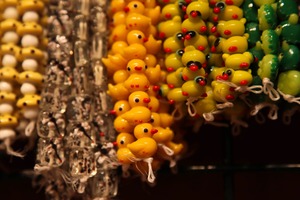 A vibrant display of colorful rubber duck figurines intertwines with gleaming transparent beads, creating a playful and inviting atmosphere. The warm, soft lighting enhances the glossy finish of each piece, evoking a sense of nostalgia and joy. Each duck, with its round eyes and cheerful demeanor, seems to invite a smile from onlookers.