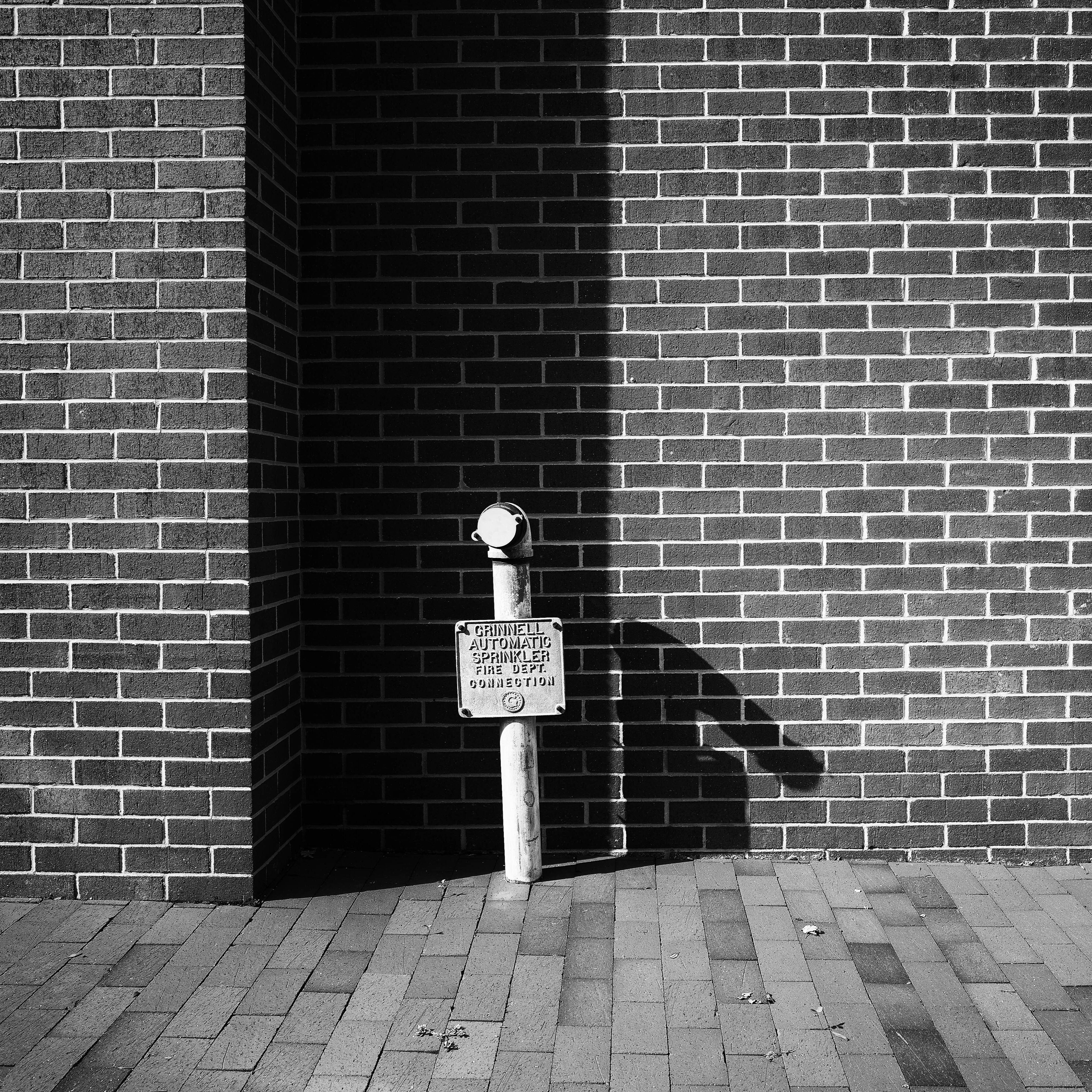 This monochromatic photograph captures an industrial sprinkler system against a textured brick wall, casting a long shadow that adds depth. The stark contrast between light and dark emphasizes the simplicity and isolation of the subject. A sense of quiet contemplation pervades the scene, inviting viewers to reflect on the relationship between urban elements and their surroundings.