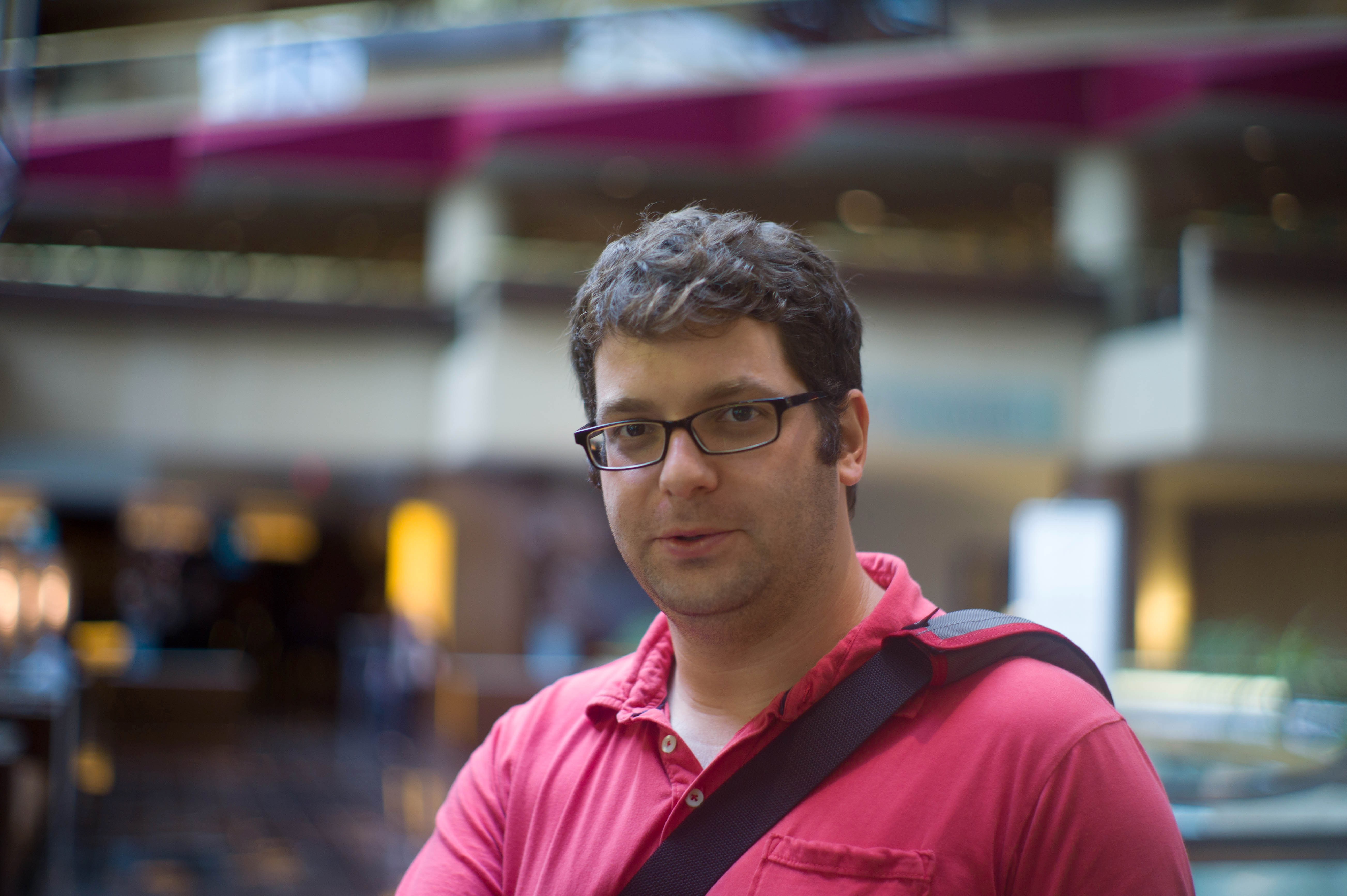 In this photograph, a man in a pink shirt stands in a softly blurred, vibrant lobby setting, suggesting a lively atmosphere teeming with activity. His steady gaze and slight frown evoke a sense of introspection amidst the bustling environment. The lighting is warm and gentle, enhancing the intimacy of the moment against the dynamic backdrop.