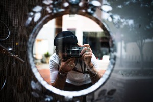 In this striking image, a photographer gazes intently through a circular window, capturing both himself and the world beyond. The interplay of light and shadow creates a contemplative mood, while the delicate decorative elements frame the subject, adding depth and intrigue. The soft background contrasts with the sharp reflection, highlighting the act of seeing and being seen.