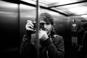 In a dimly lit elevator, a young man captures his own image through a reflective surface, creating a striking self-portrait. The black and white tones enhance the mood of introspection and solitude, while the stark lines and metallic textures of the elevator frame the subject in a modern, minimalist aesthetic. His casual attire and focused expression suggest a blend of familiarity and contemplation, inviting viewers into a moment of quiet observation.