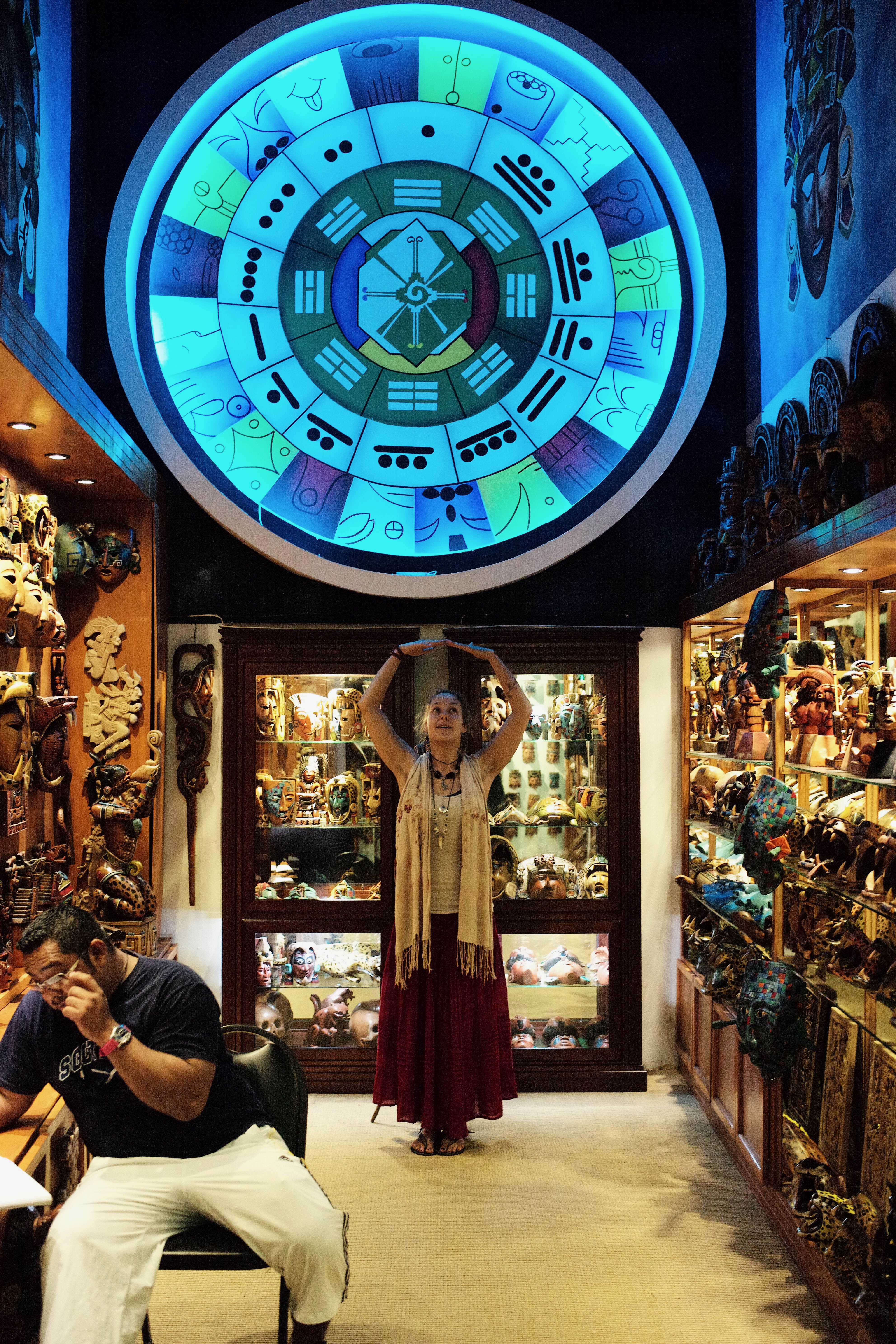 In a dimly lit space filled with vibrant artifacts, a woman stands poised with arms raised, embracing a radiant circular mural above her. The contrast of the cool blue light against the richly colored masks surrounding her creates a mystical atmosphere, evoking a sense of spiritual connection and reverence. Meanwhile, a figure in the background appears introspective, adding a layer of depth to the scene's narrative.