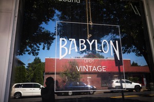 The photograph captures a vintage store sign reading 'BABYLON VINTAGE,' prominently displayed against a reflective window. The bright, sunny lighting creates a vibrant atmosphere, while the reflections of the nearby street and foliage add depth and complexity to the scene. The composition merges the world outside with the inviting promise of the store, evoking a sense of curiosity and nostalgia.