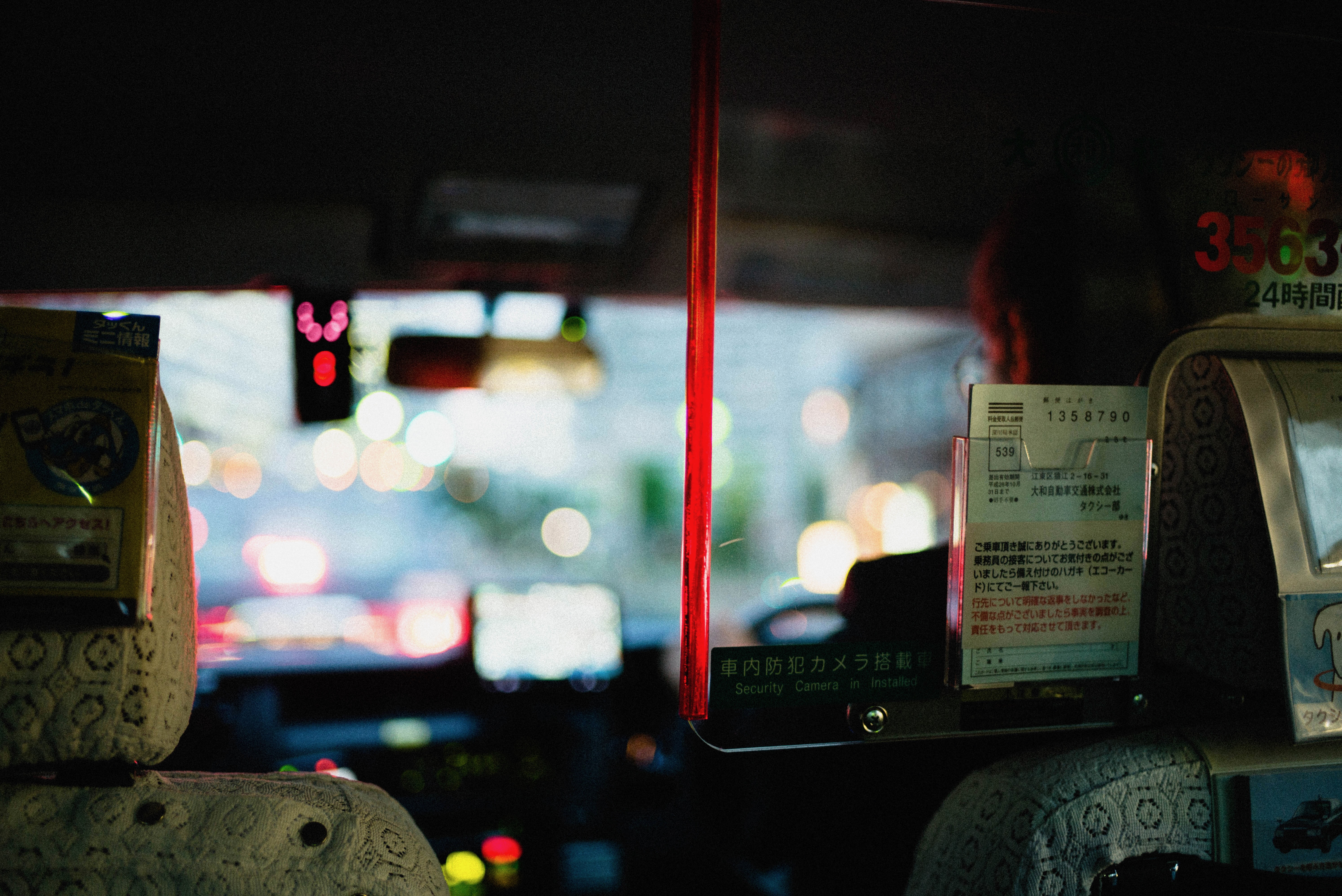 Set within the intimate confines of a taxi, the photograph captures a blurred urban landscape glowing in the backdrop, evoking a sense of movement and transition. Soft, diffused lighting bathes the scene, creating a tranquil yet dynamic atmosphere, while the dashboard's vibrant colors add depth to the composition. The overall mood is a contemplative snapshot of city life, illustrating the quiet moments between destinations.