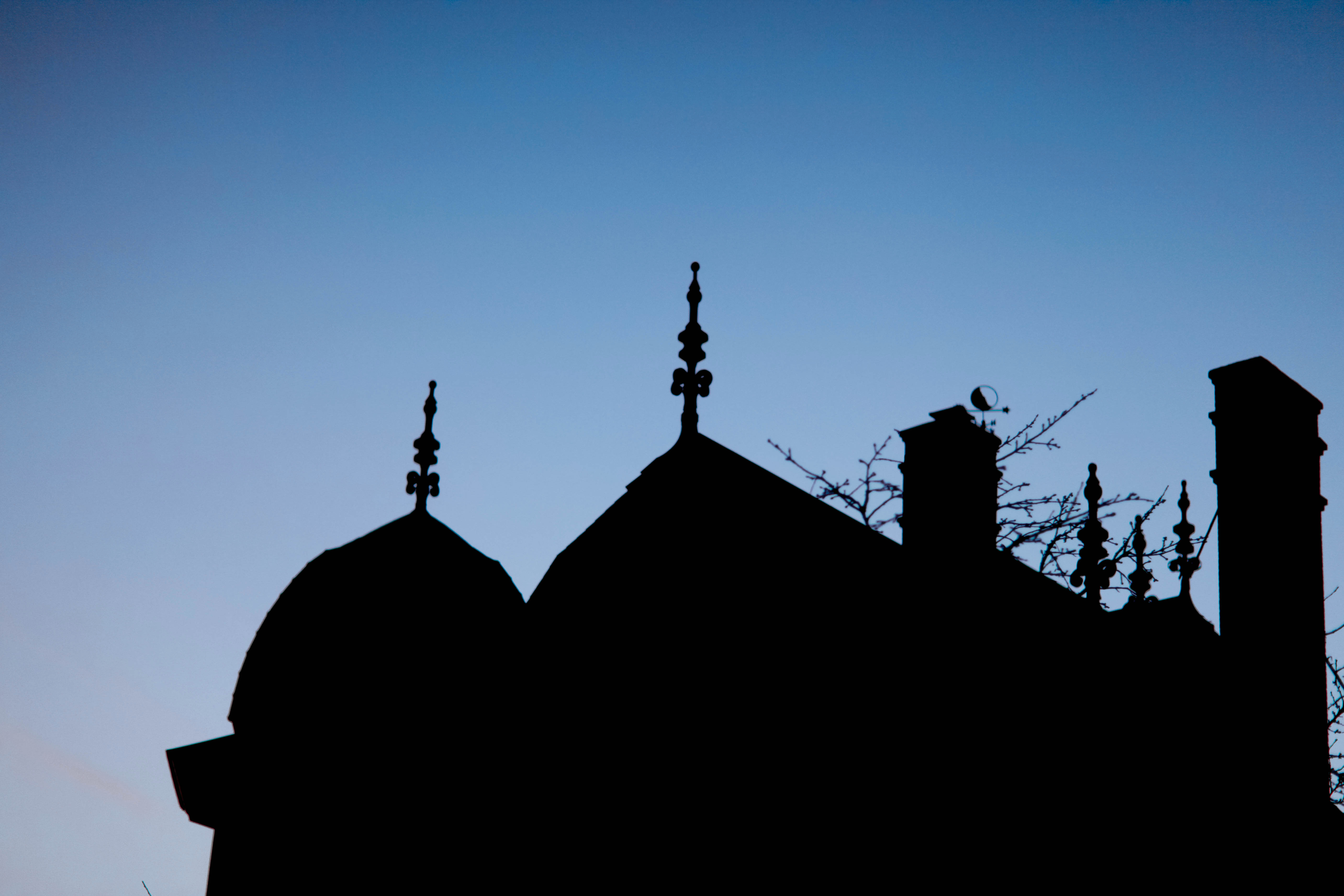 A striking silhouette of a building's ornate rooftops stands against a tranquil blue sky, highlighting the intricate spires and architectural details. The fading twilight casts a calm mood, suggesting a moment of transition between day and night. The composition emphasizes the contours of the structure, creating a dramatic interplay of light and shadow.