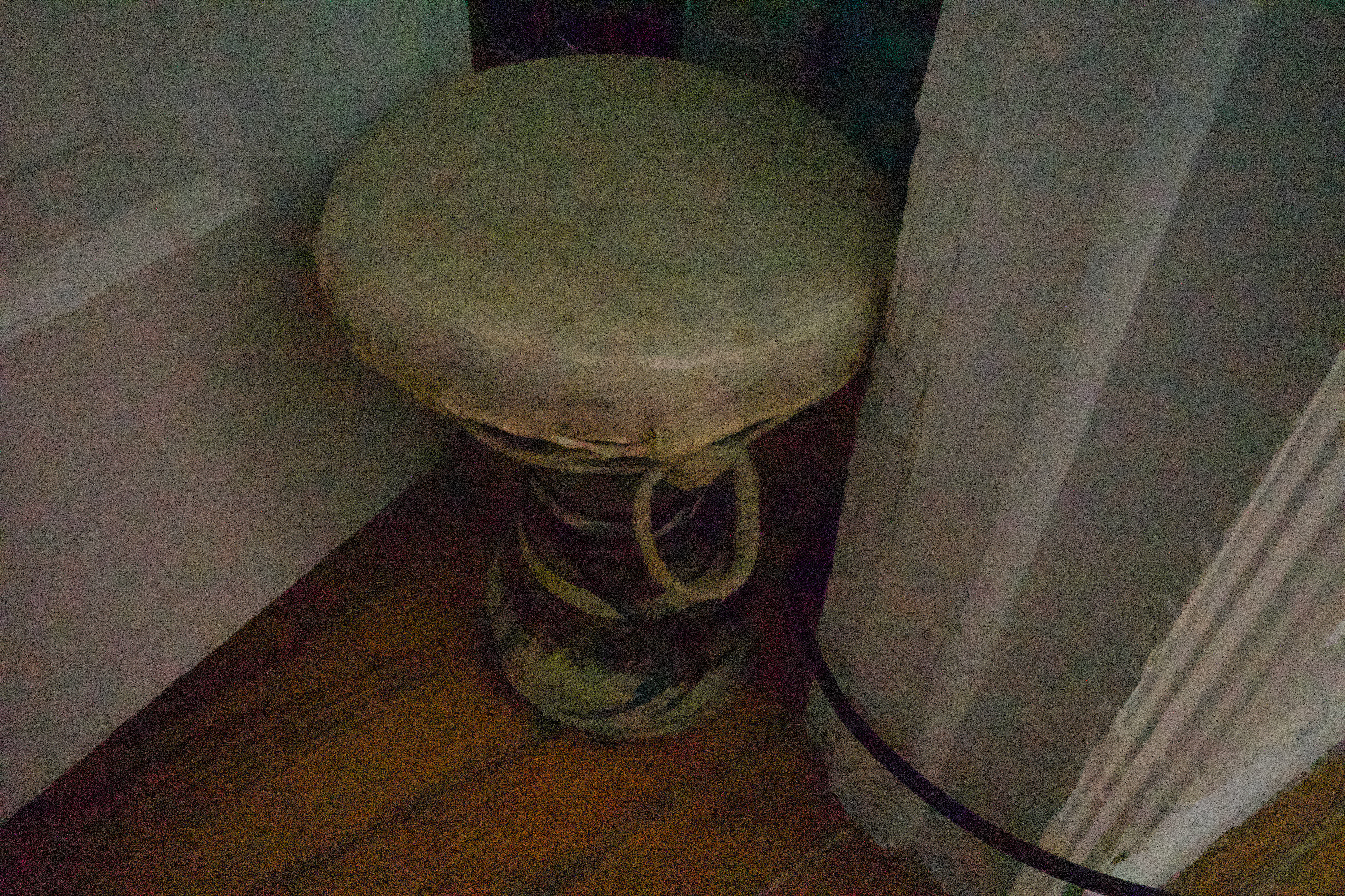 This photograph captures a worn stool tucked away in a dimly lit corner, evoking a sense of nostalgia and abandonment. The soft lighting creates gentle shadows, highlighting the stool's textured surface and faded colors, while emphasizing its isolation. The composition, framed by surrounding objects, invites contemplation about the stories and moments that have unfolded around this overlooked piece of furniture.