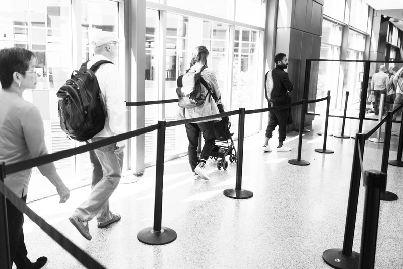 In a sunlit airport terminal, travelers form a steady line, each person embodying a different story. The scene is captured in stark black and white, emphasizing the emotions of anticipation and transition. Shadows stretch across the polished floor, creating a contrasting mood of movement and stillness within the bustling environment.