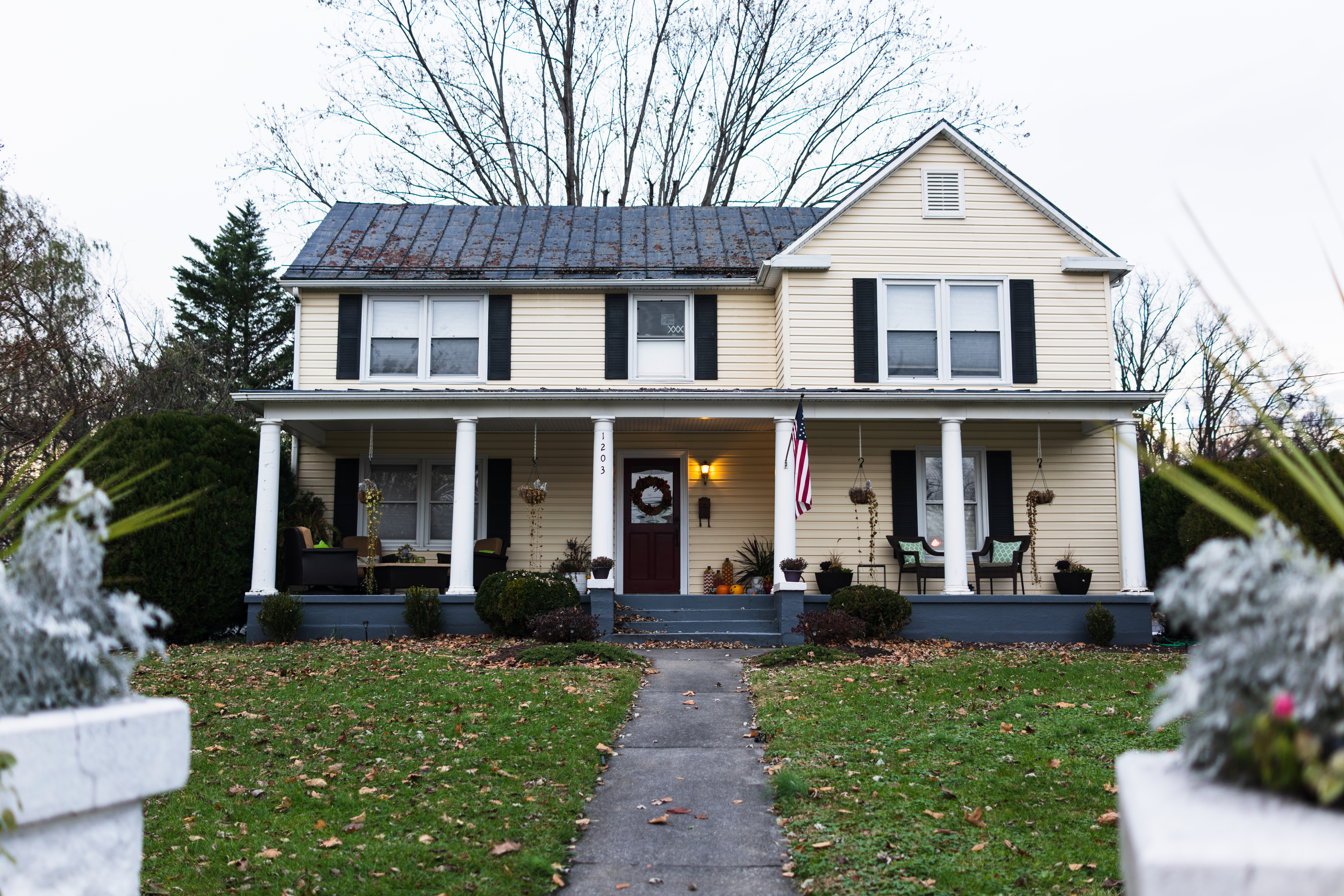 This inviting two-story home stands proudly with its yellow siding and dark green shutters, embodying a warm, welcoming charm. Soft, diffused light hints at dusk, creating a tranquil mood as fallen leaves gather on the manicured lawn. The front porch, adorned with subtle decorations and an American flag, invites a sense of nostalgia and community spirit.