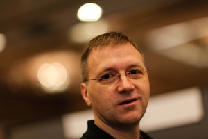 A man with short, light brown hair and glasses gazes directly at the camera, exuding a sense of warmth and openness. The background is softly blurred, featuring warm bokeh lights that create a welcoming ambiance, enhancing the subject's approachable demeanor. The lighting is soft and diffused, highlighting his features while adding a layer of intimacy to the moment.