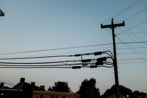 This photograph captures the intricate network of power lines against a fading twilight sky, creating a striking silhouette. The cool tones of the sky transition from blue to soft gray, evoking a tranquil mood that blends technology with nature. The composition highlights the contrast between the man-made structures and the serene evening ambiance, inviting contemplation of modern life's unseen connections.