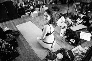 In this black-and-white photograph, a woman in underwear sits gracefully on a yoga mat, turning to smile at the viewer. The cluttered surroundings create a stark contrast to her composed demeanor, capturing a blend of intimacy and everyday realism. Soft light bathes her in a gentle glow, enhancing the candid yet artistic atmosphere of the scene.
