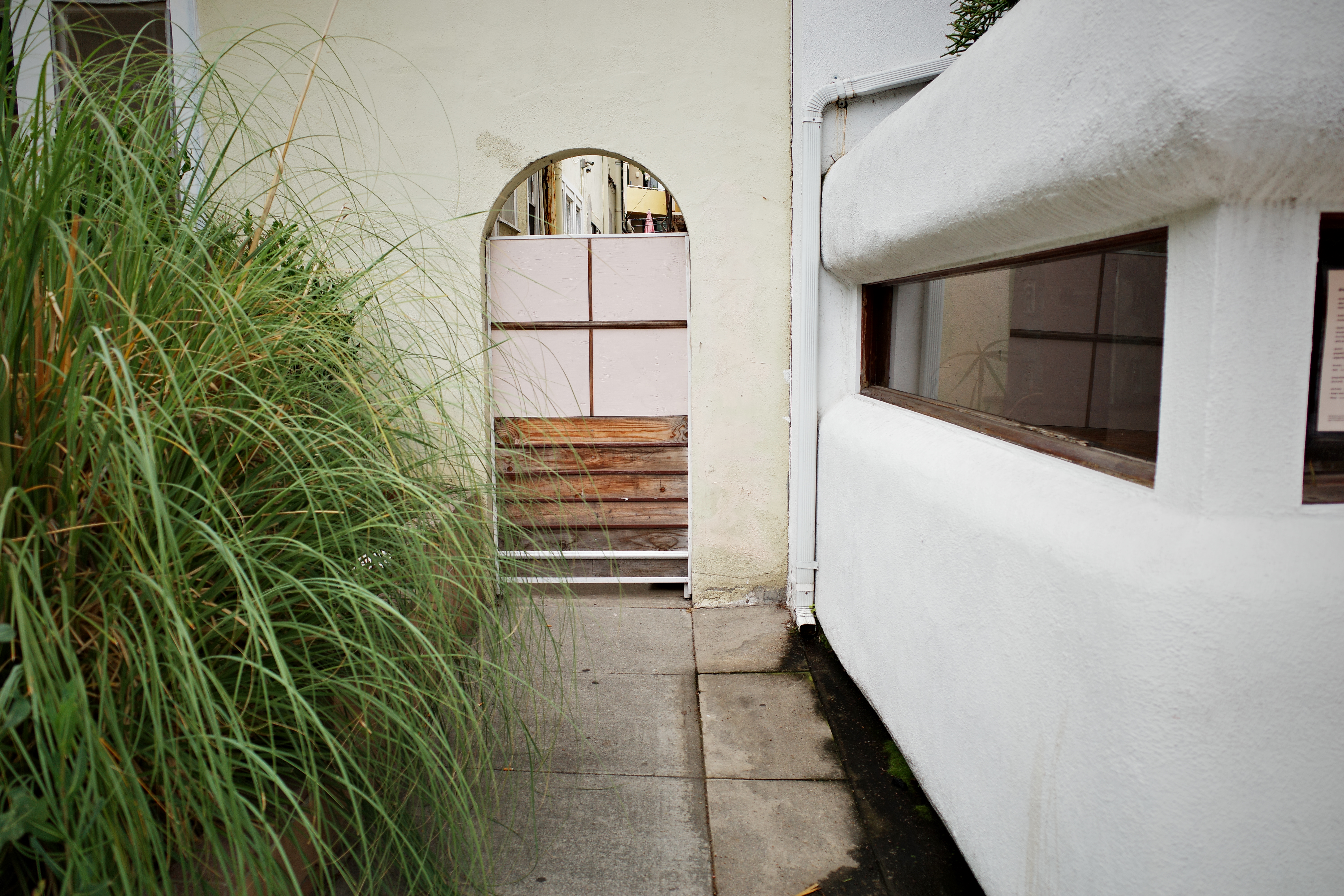 This photograph captures a serene alleyway framed by lush green grass and a minimalist structure. The soft, muted lighting enhances the tranquil mood, inviting the viewer to explore the archway leading to an unknown destination. The composition strikes a balance between natural elements and architectural lines, creating a sense of curiosity and calm.