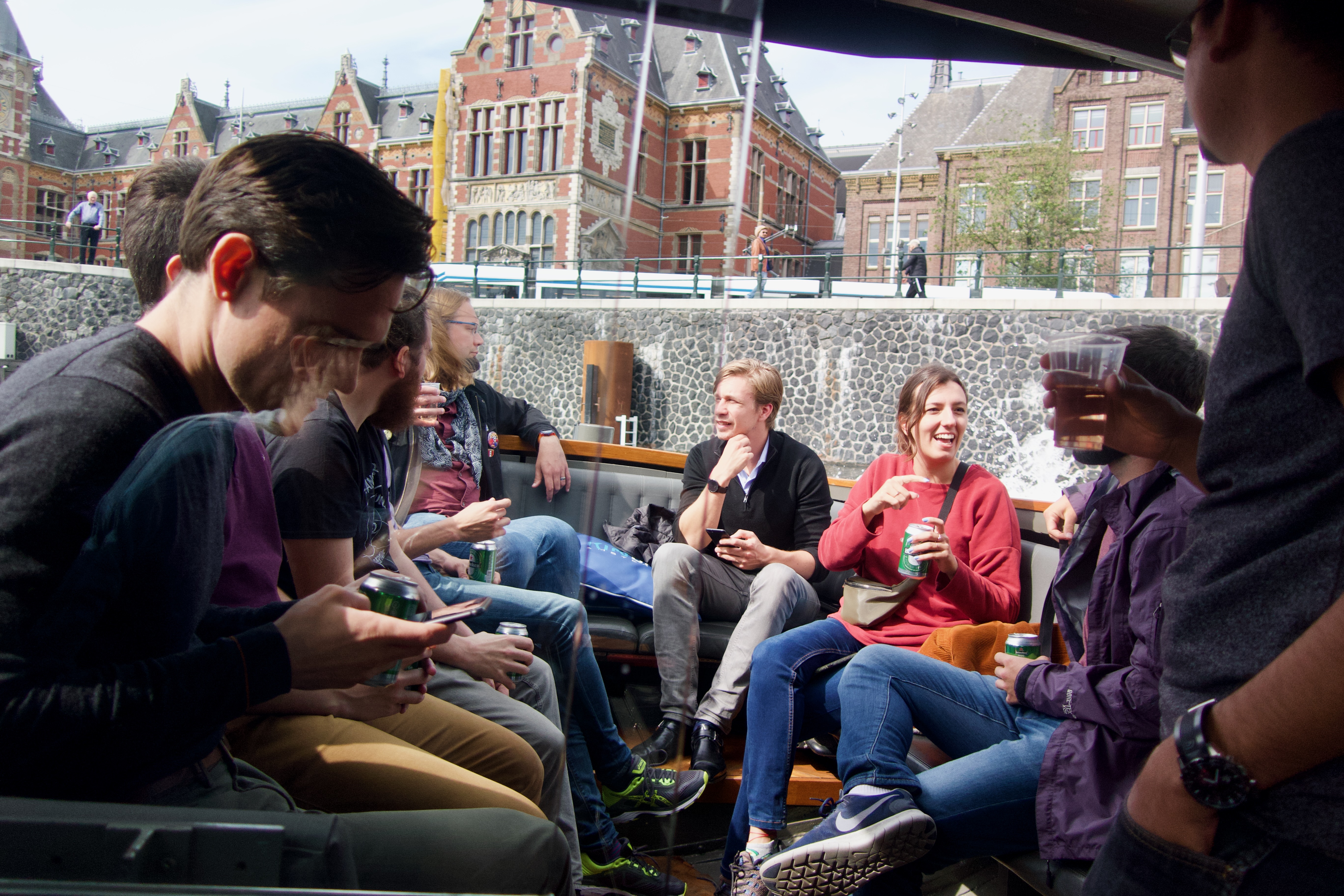 A lively group of friends share laughter and drinks in a sunlit boat, framed by the striking architecture of a historic building. The warm light enhances the cheerful atmosphere, capturing moments of connection and joy. The composition features close-knit conversations and relaxed postures, inviting viewers into their intimate social experience.