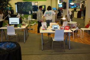 The photograph captures a bustling exhibition space, featuring modern desks illuminated by bright task lamps. The warm wooden flooring contrasts with the sleek white furniture, creating an inviting atmosphere. Attendees engage in conversation while digital displays hint at the innovative technology showcased in this collaborative environment.