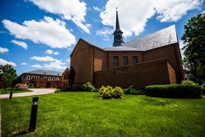 This photograph captures a charming church building, with its distinctive steeple reaching towards a bright, blue sky dotted with fluffy clouds. The vibrant green grass and neatly trimmed shrubs create a serene and welcoming atmosphere, suggesting a peaceful sanctuary in the heart of the community. The composition emphasizes the church's architectural lines while inviting viewers to reflect on the tranquility that faith can bring.