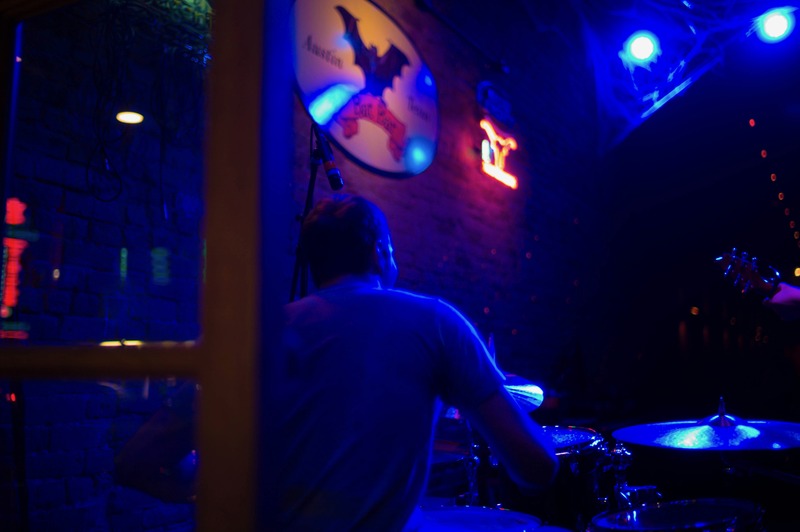 The photograph captures a drummer in a low-lit venue, enveloped in hues of deep blue and soft neon lights, creating an intimate and vibrant atmosphere. The focus on the drummer's back adds a sense of mystery and immersion, while the faint outlines of the instruments suggest a lively performance just out of sight. The composition, framed by the venue's window, enhances the feeling of being a part of a hidden musical experience.