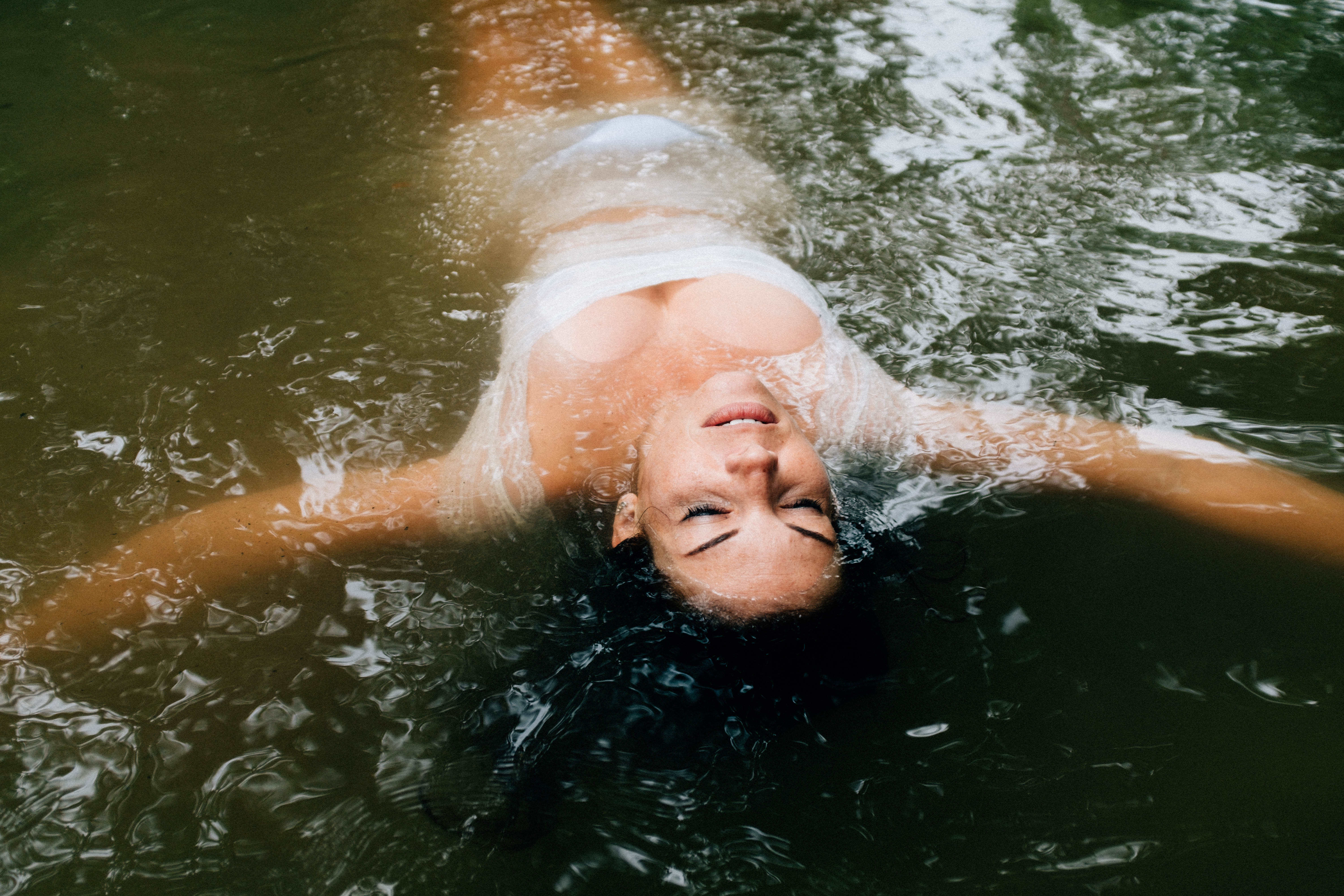 A woman floats peacefully on the surface of a tranquil, murky water, her arms outstretched and a serene expression adorning her face. The muted lighting and soft ripples create a dreamy, ethereal mood, evoking a sense of freedom and calm. The composition captures both vulnerability and strength, immersing the viewer in a moment of introspective bliss.