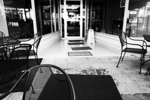 This monochrome photograph captures an empty café patio, featuring metal chairs and tables set against a sleek entrance. The composition draws the eye along the clean lines of the floor and the inviting doorway, evoking a mood of quiet solitude. The dramatic contrast of light and shadow enhances the serene atmosphere, suggesting a moment paused in time.