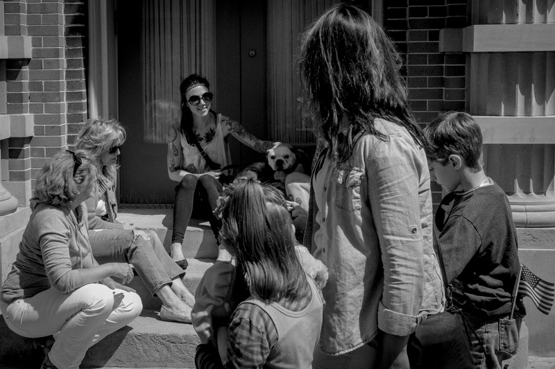 The photograph captures a lively gathering on a front porch, where a woman adorned with tattoos interacts warmly with a group of children and adults. The contrasting tones of black and white enhance the intimate mood, drawing attention to the expressions of joy and curiosity as they engage with one another. Soft natural lighting envelops the scene, creating a sense of nostalgia and community.