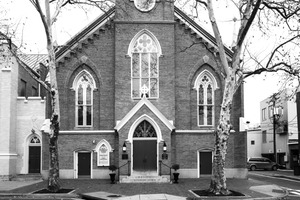 The photograph captures the majestic facade of a Gothic-style church, framed symmetrically by towering trees, their bare branches enhancing the starkness of the black-and-white composition. The lighting casts soft shadows, adding depth to the intricate details of the arched windows and brickwork. A sense of quiet reverence pervades the scene, evoking a mood of contemplation and timelessness.