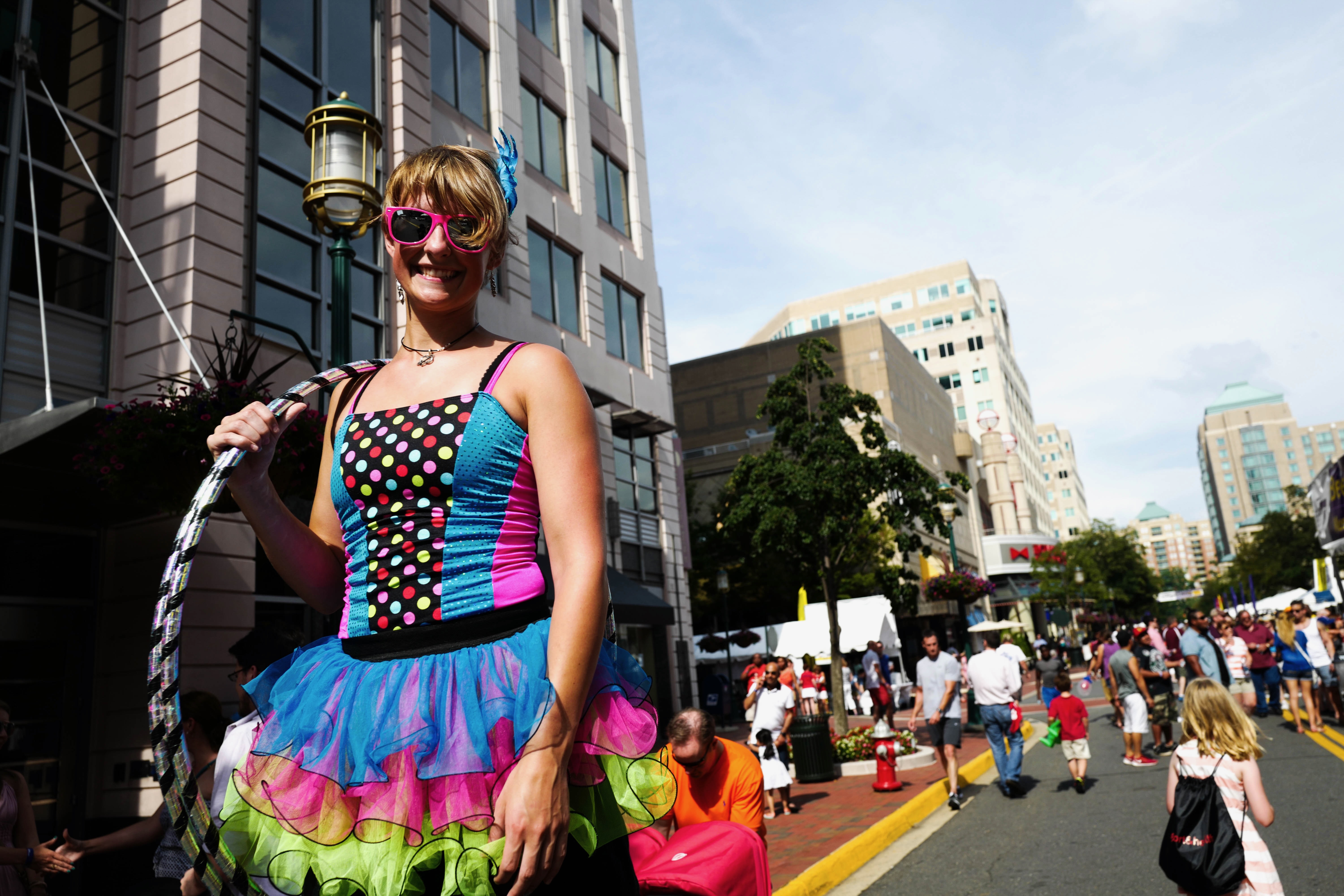 A cheerful performer, adorned in a colorful polka-dotted outfit and oversized sunglasses, stands confidently on a bustling street. The bright lighting enhances her vibrant attire, creating a lively atmosphere filled with joyful onlookers and soft urban details in the background. The composition captures the spirit of celebration, blending the performer with the dynamic crowd around her.