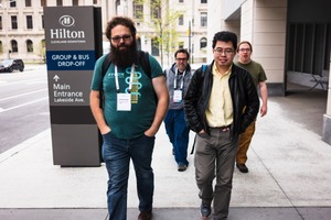 A lively group of four individuals walks together outside the Hilton in Cleveland, creating a sense of camaraderie. The soft, diffused light casts gentle shadows, emphasizing their relaxed expressions and casual attire. The urban backdrop and casual atmosphere evoke a sense of community amidst a professional setting.