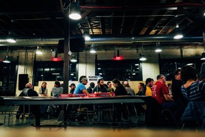 The photograph captures a lively game night in a spacious venue, filled with groups of engaged players seated at various tables. Warm overhead lighting bathes the room, creating an inviting atmosphere as laughter and camaraderie resonate among friends. A sign reading 'Players Needed' hints at the spirited competition, drawing the viewer into the vibrant social scene.
