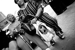 In a candid black-and-white frame, two women sit closely together, one older and one younger, exuding a sense of comfort and companionship. The composition captures the intricate details of their expressions and attire, enhanced by natural light that softly illuminates their features, evoking a mood of warmth and shared stories. Their relaxed poses and slight smiles suggest a moment of pause in a bustling outdoor setting.