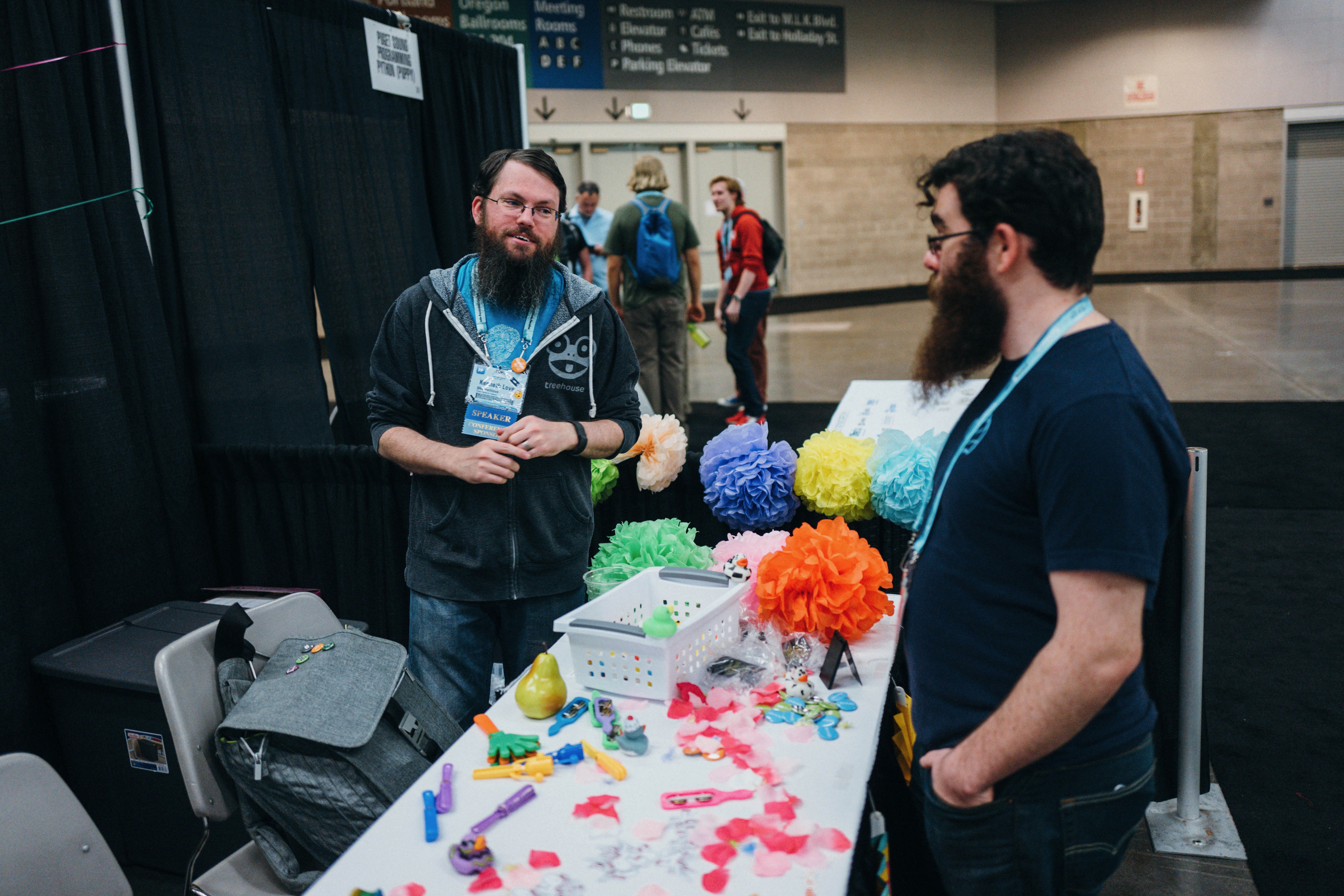 The photograph captures two men engaging in conversation at a vibrant vendor booth. Colorful decorations and playful objects create a cheerful atmosphere, while the dimly lit background emphasizes the intimacy of the interaction. The casual attire and friendly expressions hint at a relaxed, creative event filled with artistic exchange.