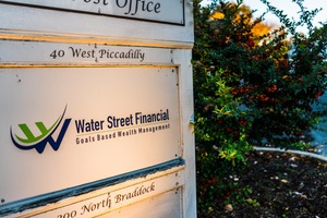 The photograph captures a well-lit business sign for Water Street Financial, positioned at the intersection of a quaint street. Warm evening light casts a gentle glow on the sign, enhancing its legibility against the backdrop of lush greenery. The composition draws attention to the sleek design of the sign, evoking a sense of professionalism and welcoming ambiance.