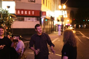 Under the soft glow of streetlights, two men engage in lively conversation, their gestures animated and expressive. The warm hues of the night create an inviting atmosphere, while vibrant storefronts add depth to the backdrop. The scene captures a moment of connection amidst the hustle of urban nightlife.
