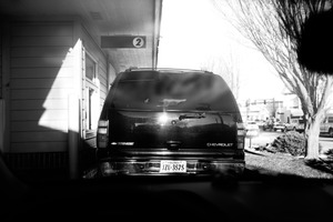 This photograph captures the back of a dark Chevrolet Tahoe parked at a drive-thru. The stark contrast of black and white enhances the mood of anticipation, with dappled sunlight casting intriguing shadows across the scene. The framed composition draws attention to the waiting vehicle against a backdrop of muted elements, creating a sense of stillness in a bustling environment.