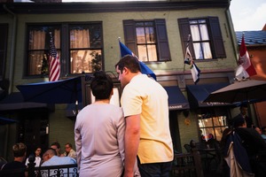 Bathed in soft golden light, a couple stands close together outside a cozy restaurant, their bodies angled towards each other in intimate conversation. The vibrant greens of the building and the surrounding umbrellas create a welcoming atmosphere, while subtle hints of dusk add warmth to the scene. The flags fluttering above hint at a lively locale, enhancing the sense of community and connection.