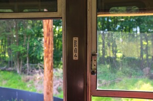 The photograph captures the interior of a vintage train, focusing on an open window that offers a glimpse into the lush greenery outside. Soft, diffused light filters through the glass, creating a serene and nostalgic atmosphere. The nearby instructions to 'KEEP ARM IN' hint at the traveler's past adventures, contrasting the peaceful scenery with a sense of caution.