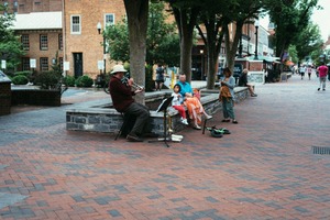 In a vibrant street scene, an elderly musician plays a lively tune on his trumpet, creating a warm, inviting atmosphere. A child, wrapped in colorful fabric, sits nearby, deeply absorbed in the music, while an adult listens with a serene smile. The soft, diffused light filtering through the trees accentuates the sense of community, drawing the viewer into this moment of connection and joy.