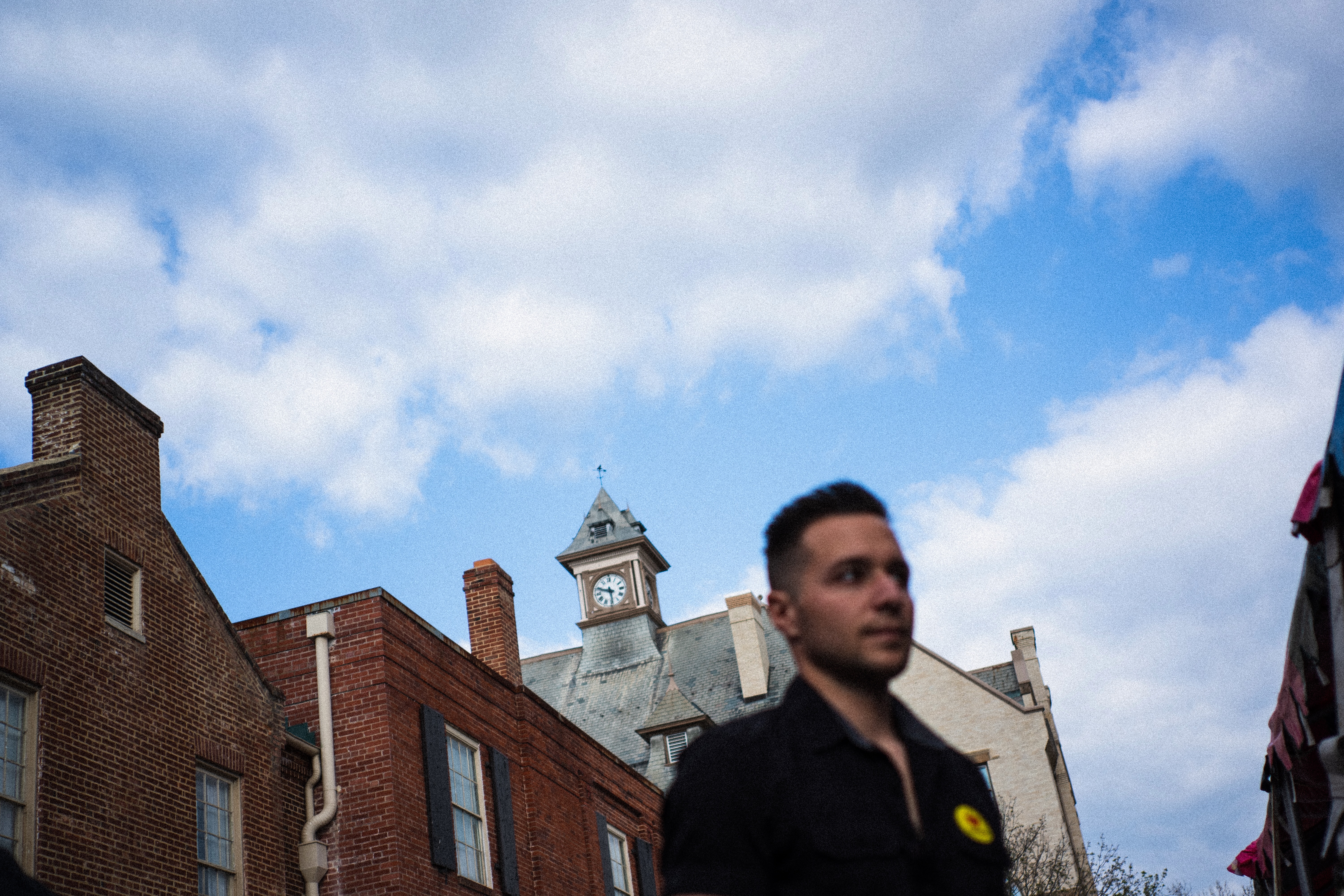 In this candid shot, a solitary figure moves through an old brick street, framed by historical buildings and a clock tower that hints at timelessness. The lighting is soft, casting a serene ambiance, while the clouds above add a touch of drama, enhancing the overall mood of reflection and connection with the past.