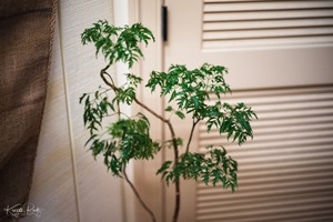 A delicate plant rises elegantly against a softly lit background of pale wood and a subtle texture of burlap. The vibrant green leaves contrast beautifully with the muted tones, creating a tranquil and inviting atmosphere. The composition draws the eye to the organic curves of the branches, evoking a sense of calm and connection to nature.