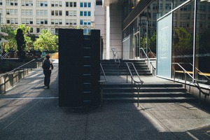 The photograph captures a solitary figure walking along a modern urban pathway, bathed in natural light that highlights the stark contrast between the structures and the pedestrian. The composition emphasizes clean lines and geometric shapes, creating a sense of structured calm amidst the city bustle. Soft greenery in the background adds a hint of vitality to the otherwise minimalist scene.
