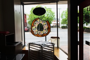 The photograph captures a charming bakery scene framed by a large, decorative donut hanging in the window, inviting passersby. Natural light filters through the glass, casting a soft glow on the simple furnishings within, enhancing a warm and nostalgic mood. Outside, life continues with blurred figures and greenery, contrasting the cozy stillness of the shop's interior.