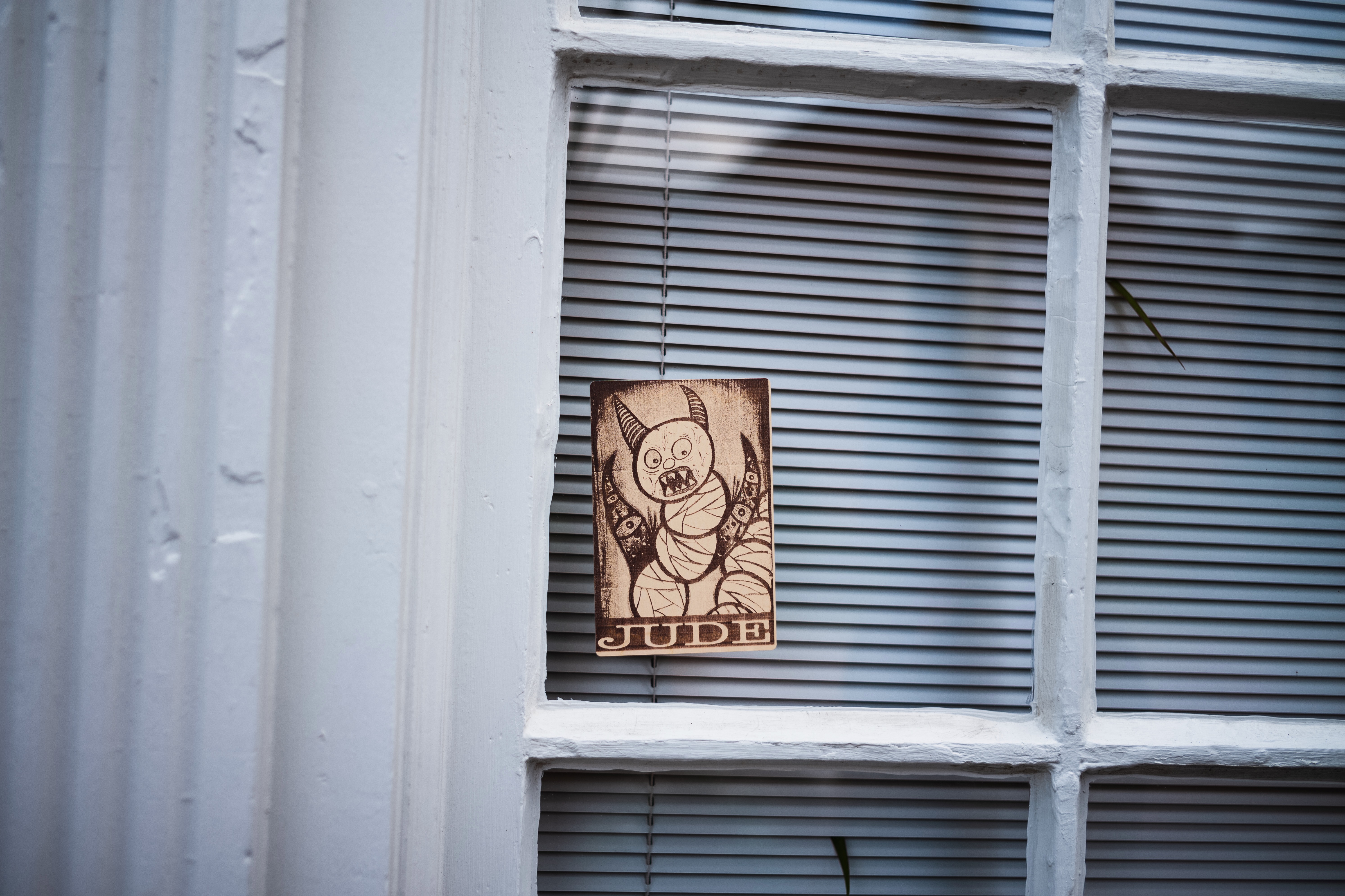 A whimsical illustration of a character named Jude adorns a white window, contrasting sharply against the muted tones of the blinds behind it. The playful expression and bold features of the artwork inject a sense of mischief and personality into the otherwise calm environment. Soft natural light highlights the texture of the drawing, creating an inviting yet cheeky ambiance.