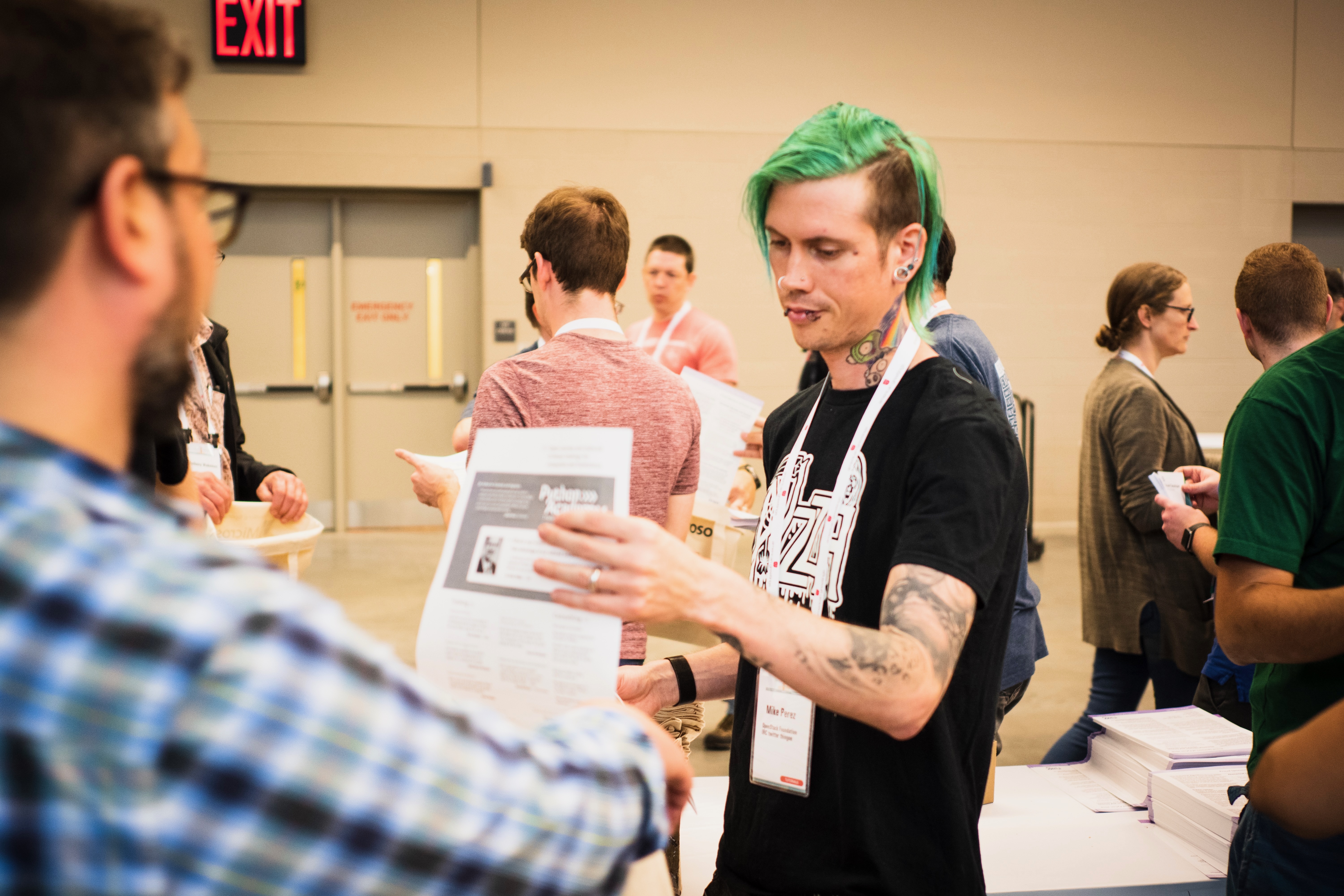 In a bustling setting, individuals engage in conversation and exchange informational materials, capturing the essence of networking. The striking green hair of the central figure draws the eye, contrasting with the neutral tones of the background and adding energy to the moment. Soft, even lighting enhances the friendly atmosphere, inviting connection and collaboration among attendees.