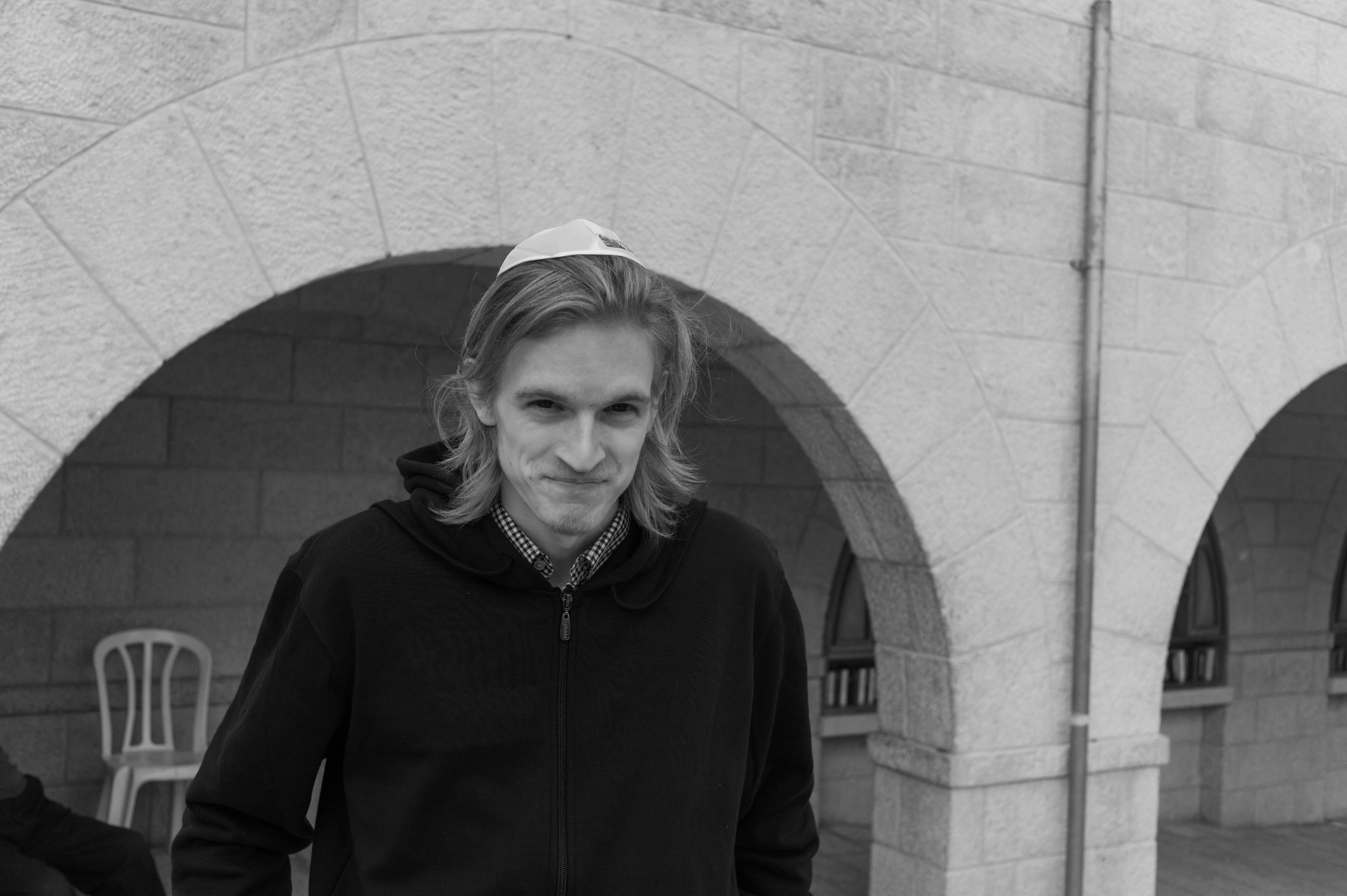 The photograph captures a young man wearing a traditional kippah, exuding a mix of pride and playfulness. Soft lighting highlights his features against a backdrop of arched stone architecture, creating a serene yet dynamic mood. The black-and-white composition accentuates textures and contrasts, drawing focus to the subject's expressive smile amidst the tranquil environment.