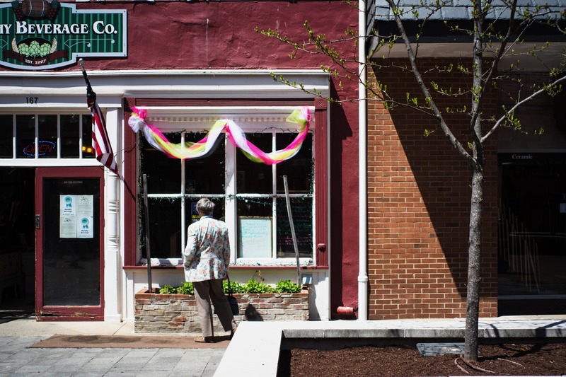 In this charming street scene, an older woman stands pensively outside a vibrant storefront, her back turned as she gazes through the decorated window. The bright, playful ribbons contrast with the deep reds of the building, creating a lively yet contemplative atmosphere. Sunlight bathes the scene, casting soft shadows and emphasizing the serene moment of curiosity and reflection.