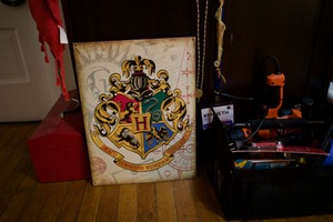 The photograph captures a vibrant depiction of a Hogwarts crest, nestled among everyday items, creating a whimsical contrast between fantasy and reality. The warm lighting casts gentle shadows, enhancing the richness of the crest’s colors while hinting at a cozy, lived-in space. The composition’s blend of magical elements and mundane tools evokes a nostalgic sense of connection to both imagination and practicality.