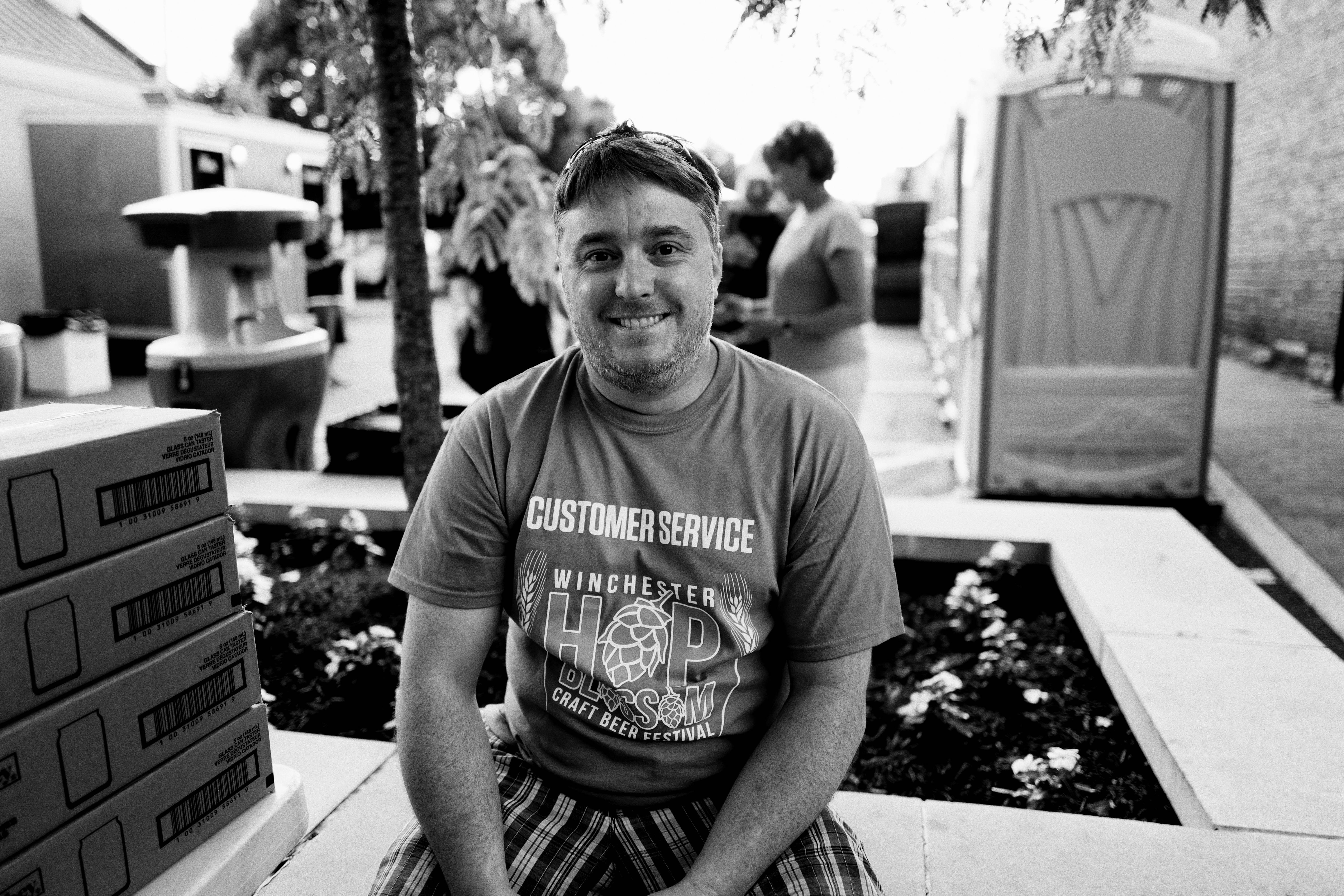 In this candid black-and-white photograph, a man sits comfortably amidst a bustling outdoor festival setting, exuding warmth and a friendly demeanor. The composition captures him in sharp focus, with the soft blur of activity in the background, highlighting both the vibrant environment and his approachable spirit. The lighting is natural, lending a relaxed atmosphere that enhances his genuine smile and the sense of community around him.