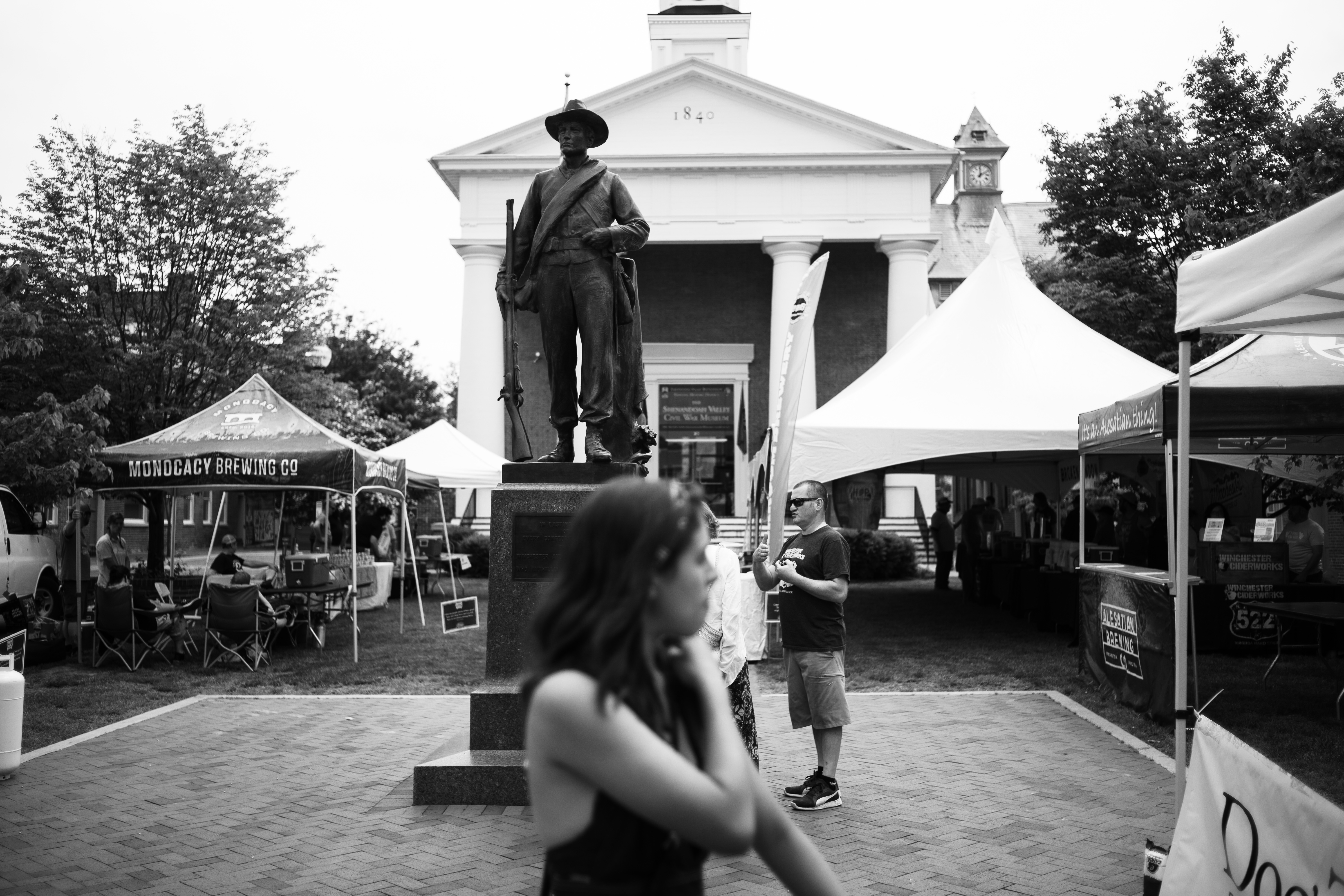 In this striking black-and-white photograph, a soldier's statue stands prominently as a backdrop to a bustling market scene. The contrasting elements of motion and stillness create an engaging dynamic, with visitors captured in candid moments. The soft, diffused light evokes a serene atmosphere, inviting viewers to reflect on both the historical and communal significance of the setting.