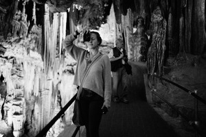 In a dimly lit cavern, a woman focuses intently on her camera, embodying curiosity and adventure. The surrounding stalactites create a mystical backdrop, while the soft light reveals textures that evoke a sense of wonder. The monochrome palette enhances the enigmatic atmosphere, highlighting the juxtaposition between the subject and the ancient formations behind her.