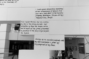 This striking black-and-white photograph captures a wall covered in handwritten text, revealing a narrative of alienation and intense emotion. The composition invites the viewer to ponder the connection between the written words and the muted interactions of people in the foreground, evoking a sense of disconnection and frustration. The lighting is even and soft, enhancing the contemplative mood, as the words draw attention to the inner turmoil against a backdrop of everyday life.